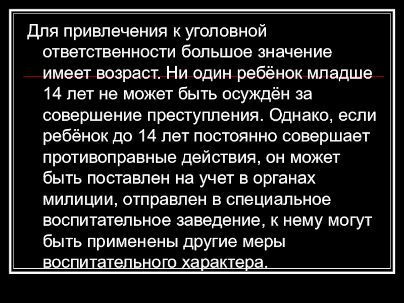 Слайд 34Для привлечения к уголовной ответственности большое значение имеет возраст. Ни один