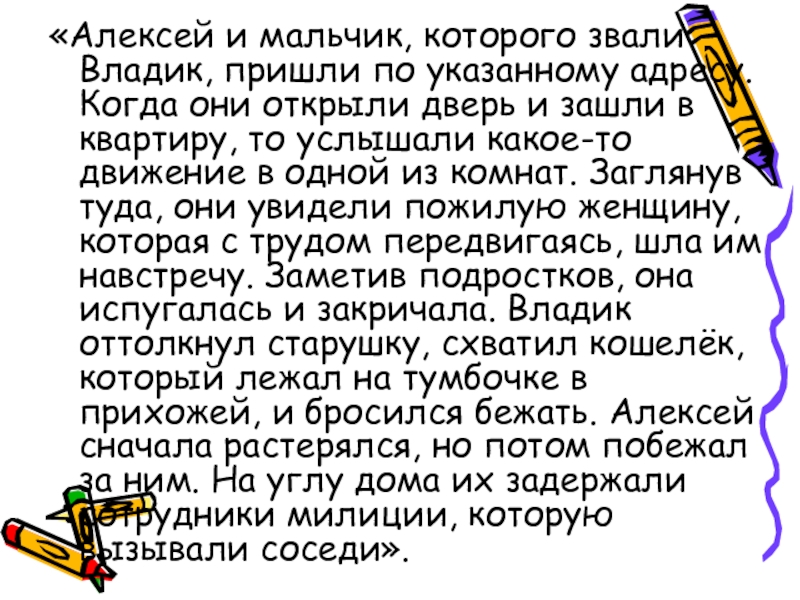 они открыли дверь и зашли в квартиру, то услышали какое-то движение в одной из комнат. Заглянув туда, они увидели пожилую женщину, которая с трудом передвигаясь, шла им навстречу. Заметив подростков, она испугалась и закричала. Владик оттолкнул старушку, схватил кошелёк, который лежал на тумбочке в прихожей, и бросился бежать. Алексей сначала растерялся, но потом побежал за ним. На углу дома их задержали сотрудники милиции, которую вызывали соседи».