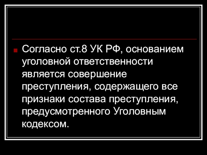 Слайд 10Согласно ст.8 УК РФ, основанием уголовной ответственности является совершение преступления, содержащего