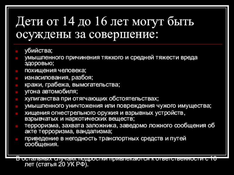 Слайд 35Дети от 14 до 16 лет могут быть осуждены за совершение: