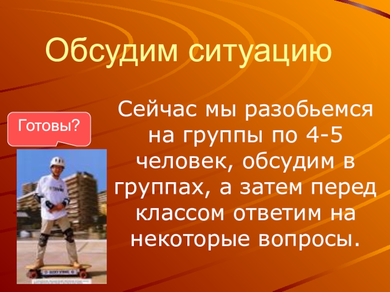 Сейчас мы разобьемся на группы по 4-5 человек, обсудим в