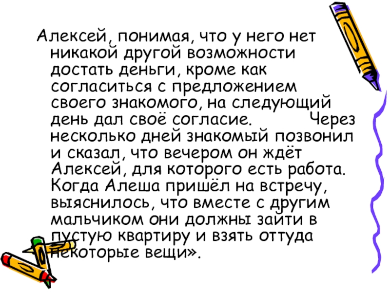 кроме как согласиться с предложением своего знакомого, на следующий день дал своё согласие. Через несколько дней знакомый позвонил и сказал, что вечером он ждёт Алексей, для которого есть работа. Когда Алеша пришёл на встречу, выяснилось, что вместе с другим мальчиком они должны зайти в пустую квартиру и взять оттуда некоторые вещи».