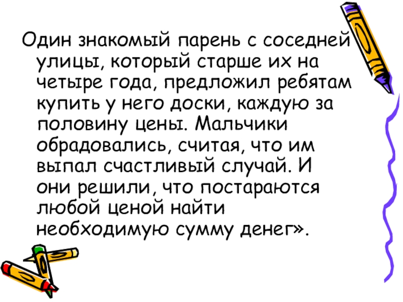 года, предложил ребятам купить у него доски, каждую за половину цены. Мальчики обрадовались, считая, что им выпал счастливый случай. И они решили, что постараются любой ценой найти необходимую сумму денег».