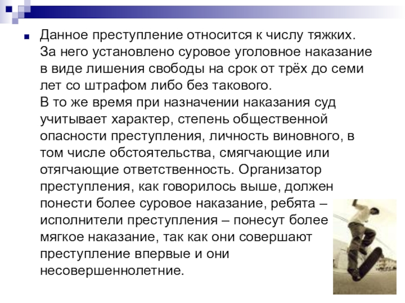 Слайд 59Данное преступление относится к числу тяжких. За него установлено суровое уголовное