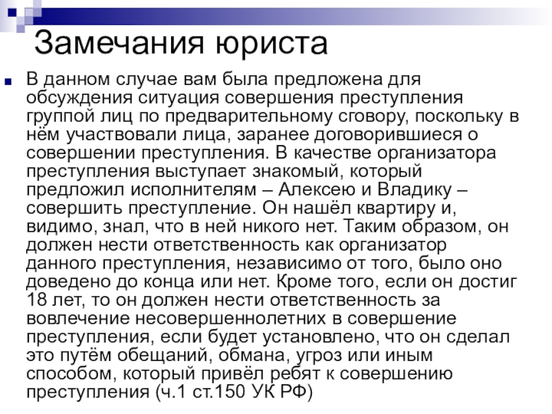 преступления группой лиц по предварительному сговору, поскольку в нём участвовали лица, заранее договорившиеся о совершении преступления. В качестве организатора преступления выступает знакомый, который предложил исполнителям – Алексею и Владику – совершить преступление. Он нашёл квартиру и, видимо, знал, что в ней никого нет. Таким образом, он должен нести ответственность как организатор данного преступления, независимо от того, было оно доведено до конца или нет. Кроме того, если он достиг 18 лет, то он должен нести ответственность за вовлечение несовершеннолетних в совершение преступления, если будет установлено, что он сделал это путём обещаний, обмана, угроз или иным способом, который привёл ребят к совершению преступления (ч.1 ст.150 УК РФ)