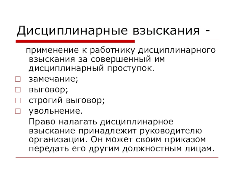 Право налагать дисциплинарное взыскание принадлежит руководителю организации. Он может своим приказом передать его другим должностным лицам.