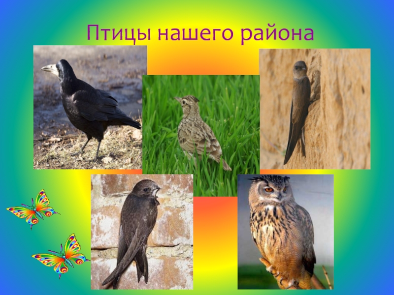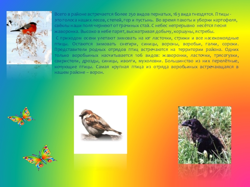 С приходом осени улетают зимовать на юг ласточки, стрижи и все насекомоядные птицы. Остаются зимовать снегири, синицы, вороны, воробьи, галки, сороки. Представители родных отрядов птиц встречаются на территории района. Одних только воробьиных насчитывается 106 видов: жаворонки, ласточки, трясогузки, свиристели, дрозды, синицы, иволги, мухоловки. Большинство из них перелётные, кочующие птицы. Самая крупная птица из отряда воробьиных встречающаяся в нашем районе – ворон.