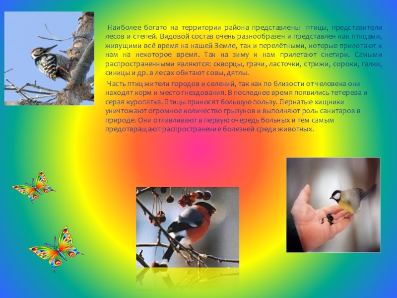 Птицы - это голоса наших лесов, степей, гор и пустынь. Во время пахоты и уборки картофеля, свёклы наши поля чернеют от грачиных стай. С небес непрерывно несётся песня жаворонка. Высоко в небе парят, высматривая добычу, коршуны, ястребы.