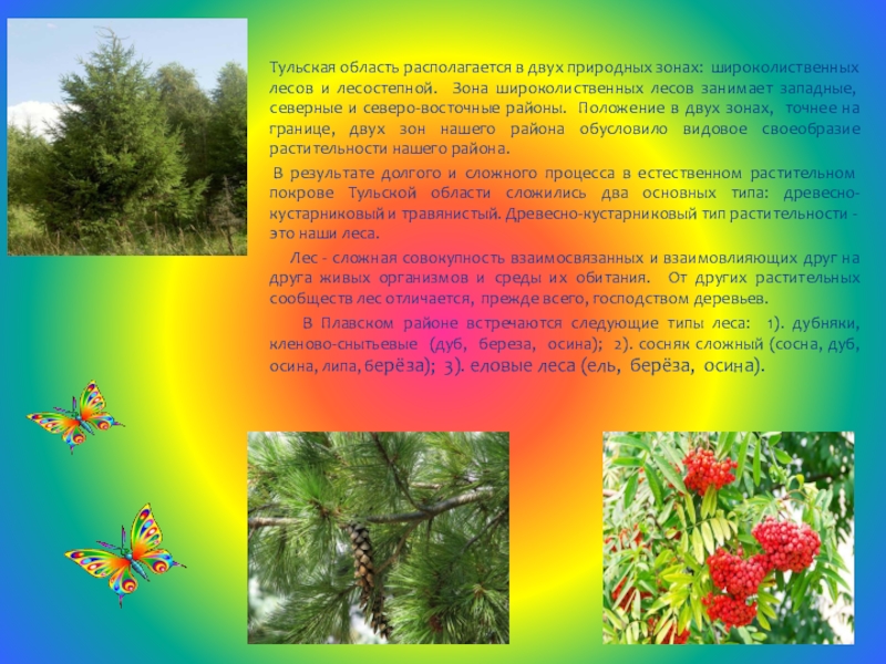 В результате долгого и сложного процесса в естественном растительном покрове Тульской области сложились два основных типа: древесно-кустарниковый и травянистый. Древесно-кустарниковый тип растительности - это наши леса.