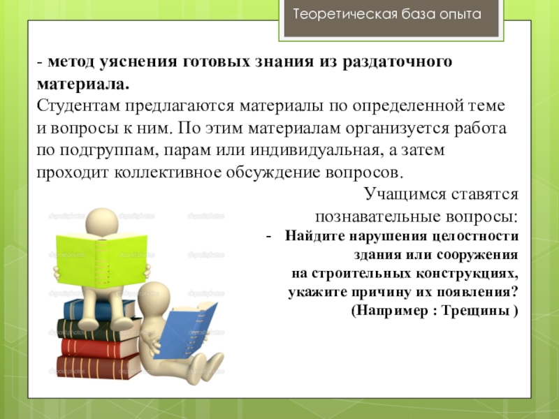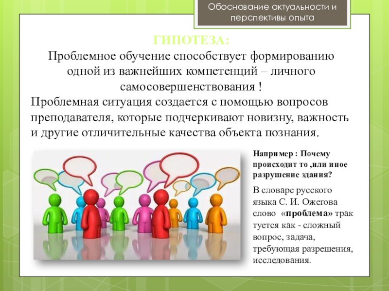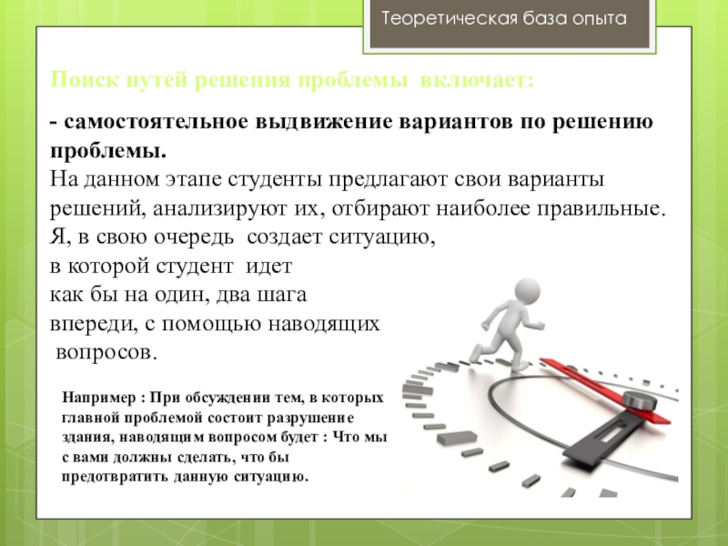 Например : При обсуждении тем, в которых главной проблемой состоит разрушение здания, наводящим вопросом будет : Что мы с вами должны сделать, что бы предотвратить данную ситуацию.