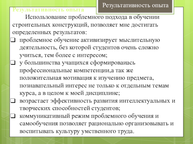 Через проблемное обучение создать условия, развивающие активную и разностороннюю мыслительную деятельность студентов, способствующую формированию критического мышления, развитию личности.