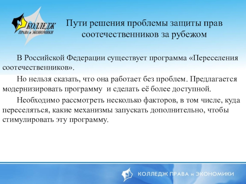 Пути решения проблемы защиты прав соотечественников за рубежом    В Российской Федерации существует программа «Переселения