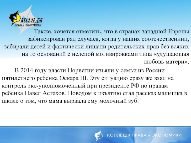 В 2014 году власти Норвегии изъяли у семьи из России пятилетнего ребенка Оскара Ш. Эту ситуацию сразу же взял на контроль экс-уполномоченный при президенте РФ по правам ребенка Павел Астахов. Поводом к изъятию стал рассказ мальчика в школе о том, что мама вырвала ему молочный зуб.