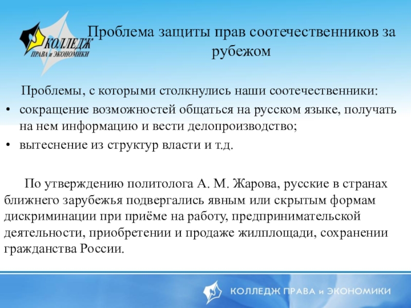 Проблема защиты прав соотечественников за рубежом   Проблемы, с которыми столкнулись наши соотечественники:сокращение возможностей общаться на