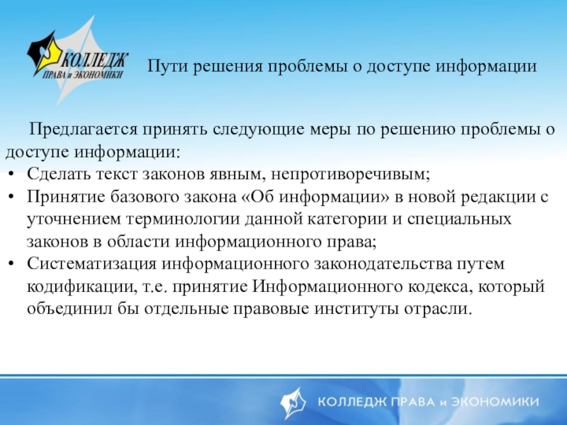 Пути решения проблемы о доступе информации   Предлагается принять следующие меры по решению проблемы о доступе