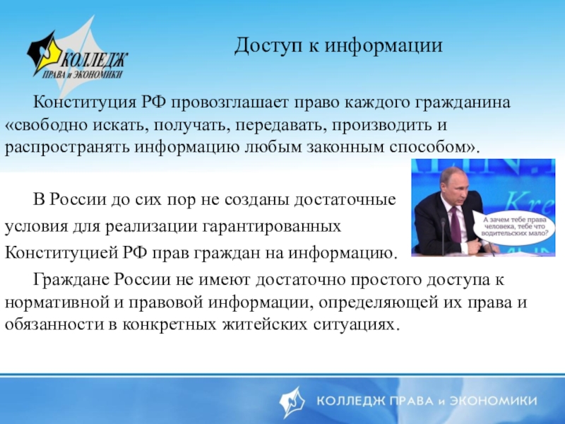 Доступ к информации   Конституция РФ провозглашает право каждого гражданина