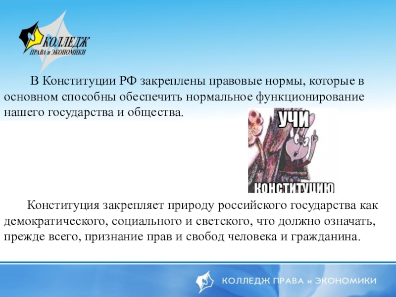 Слайд 3 В Конституции РФ закреплены правовые нормы, которые