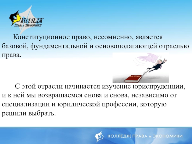 Конституционное право, несомненно, является базовой, фундаментальной и основополагающей отраслью права. С этой отрасли начинается изучение юриспруденции, и к ней мы возвращаемся снова и снова, независимо от специализации и юридической профессии,