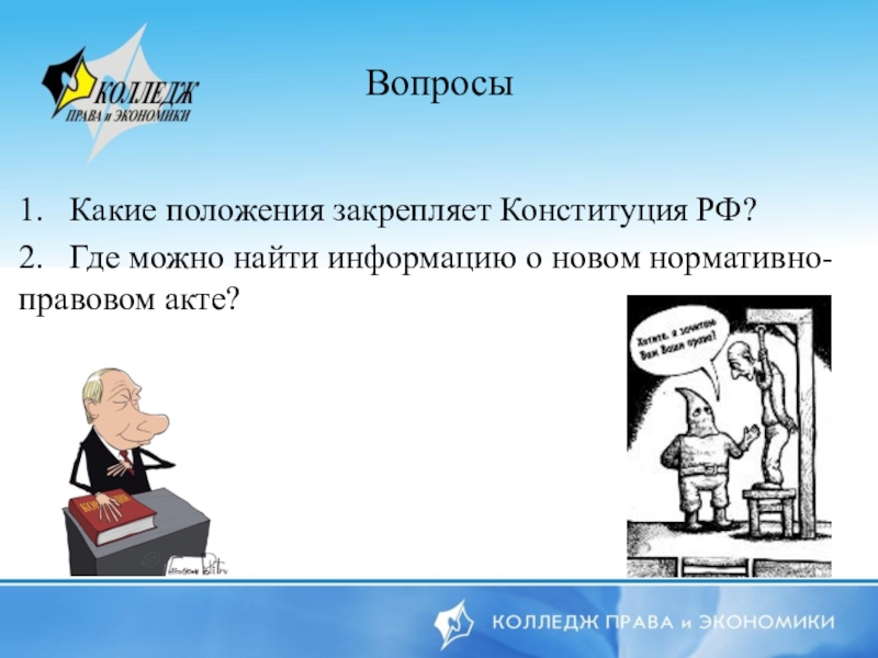 Вопросы 1.  Какие положения закрепляет Конституция РФ?2.  Где можно найти информацию о новом нормативно-правовом акте?