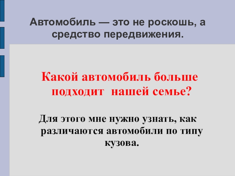 Автомобиль — это не роскошь, а средство передвижения. Какой автомобиль больше подходит нашей семье?Для этого мне нужно узнать, как различаются автомобили по типу кузова.