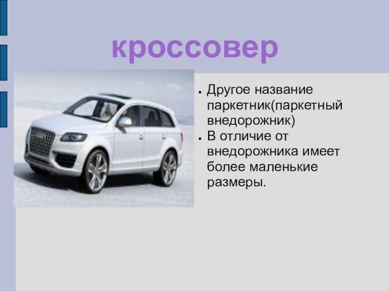 кроссоверДругое название паркетник(паркетный внедорожник)В отличие от внедорожника имеет более маленькие размеры.