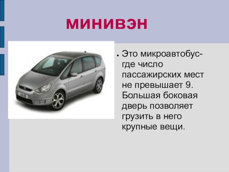 минивэнЭто микроавтобус-где число пассажирских мест не превышает 9. Большая боковая дверь позволяет грузить в него крупные вещи.