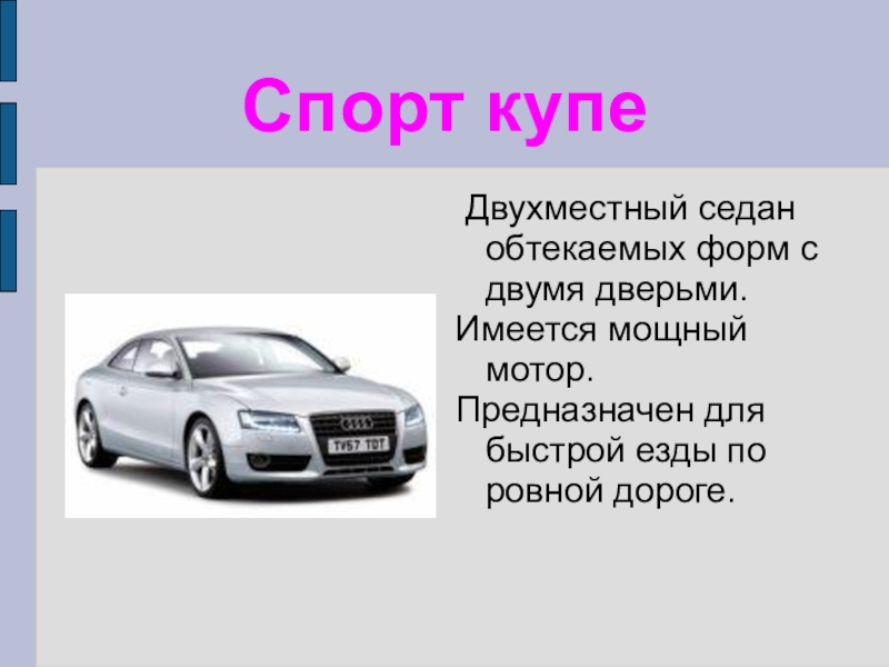 Спорт купе Двухместный седан обтекаемых форм с двумя дверьми.Имеется мощный мотор.Предназначен для быстрой езды по ровной дороге.