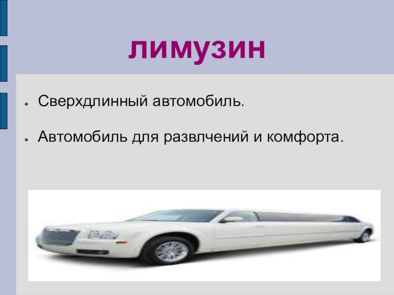 лимузинСверхдлинный автомобиль.Автомобиль для развлчений и комфорта.