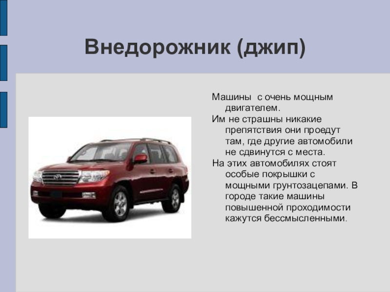 Внедорожник (джип)Машины с очень мощным двигателем.Им не страшны никакие препятствия они проедут там, где другие автомобили не