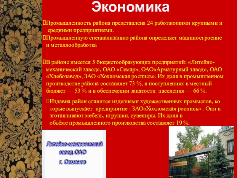 ЦЕЛЬ: дать экономико – географическую характеристику г. Семёнов, как столицы золотой хохломы.