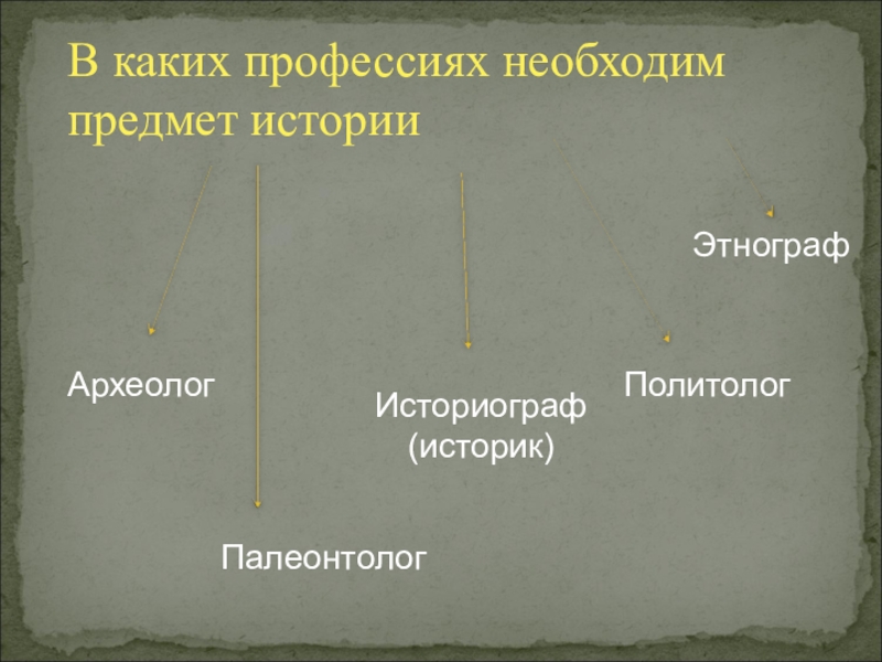 Думаю, что многие профессии относится к предмету истории, например, историограф, палеонтолог, этнограф, политолог, археолог.