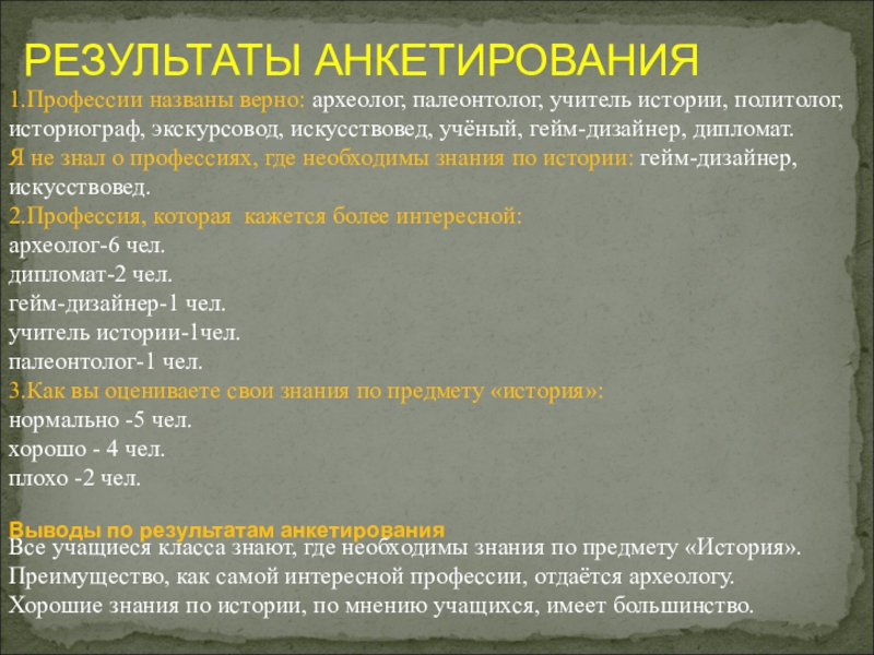 Все учащиеся класса знают, где необходимы знания по предмету «История».Преимущество, как самой интересной профессии, отдаётся археологу.