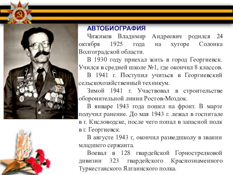 Чижиков Владимир Андреевич родился 24 октября 1925 года на хуторе Солонка