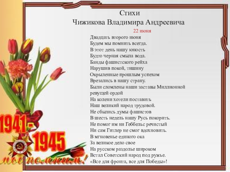 Я хочу рассказать об одном из них - ветеране Чижикове Владимире Андреевиче. В настоящее время ему исполнилось восемьдесят девять лет. Часто напоминают о себе ранения, полученные во время Великой Отечественной войны. Но не сдается старый ветеран.
