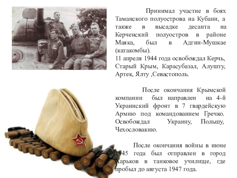 11 апреля 1944 года освобождал Керчь, Старый Крым, Карасубазал, Алушту, Артек, Ялту ,Севастополь.