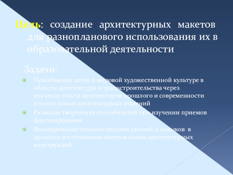 Слайд 2Цель: создание архитектурных макетов для разнопланового использования их в образовательной деятельности