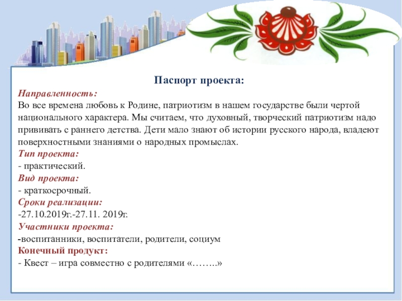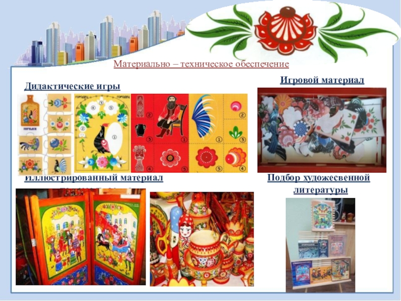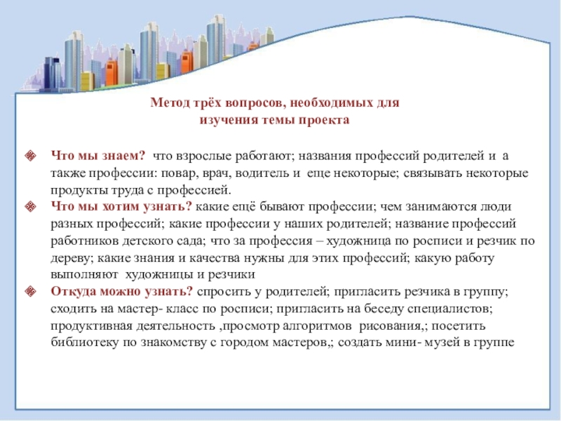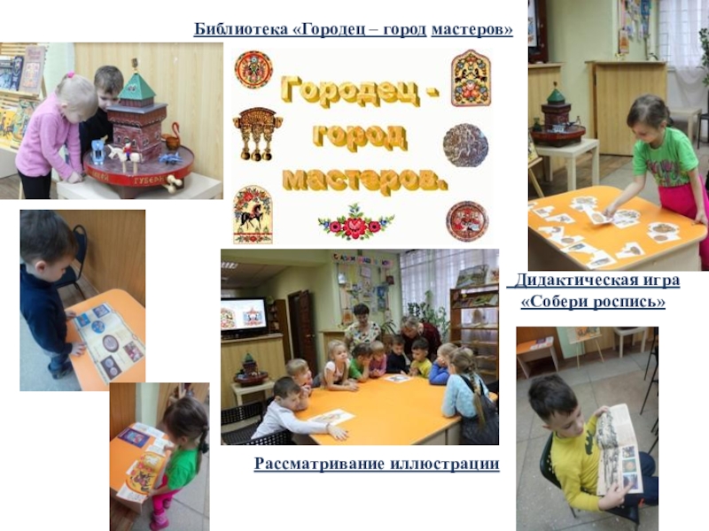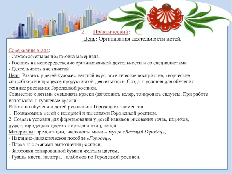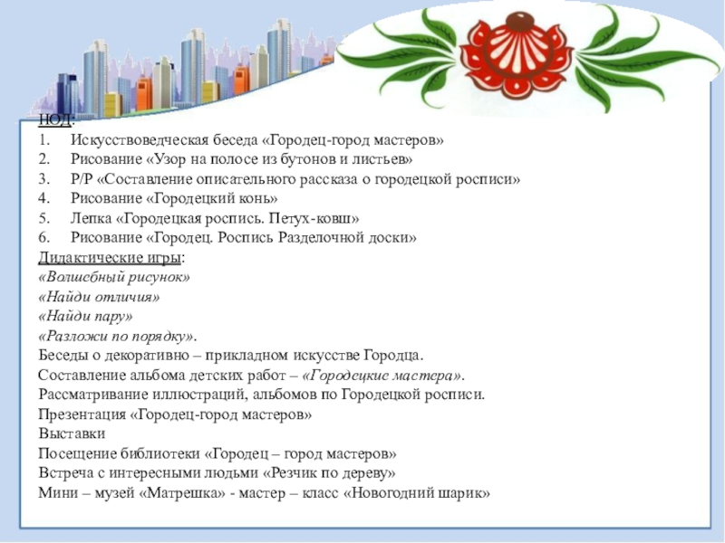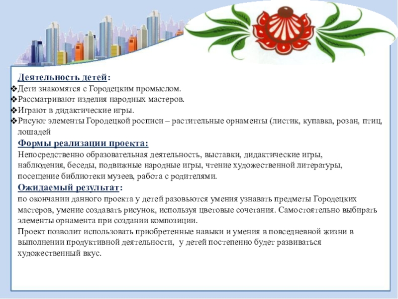 Обучение детей в подборе прилагательных в отзывах о народных промыслах; закрепление умений в отгадывании загадок о разнообразии народных промыслов; заучивание стихов, песенок о городецкой росписи; чтение художественной литературы по теме проекта;