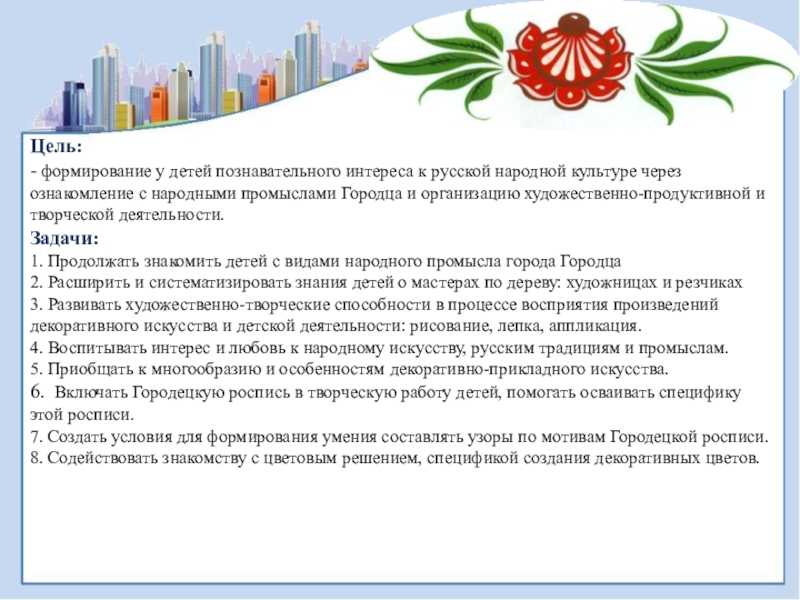 Расширение знаний детей о профессиях художница и резчик по дереву; расширение и углубление знания детей по данной теме; ознакомление детей со спецификой работы художницы и резчика по дереву; воспитывать эмоциональную отзывчивость при восприятии произведений изобразительного искусства Городецких изделий; развивать художественный вкус детей в процессе ознакомления с характерными особенностями и элементами Городецкой росписи.