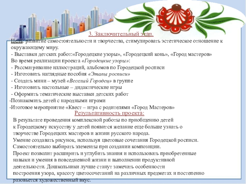 В результате проведения комплексной работы по приобщению детей к Городецкому искусству у детей появится желание еще больше узнать о творчестве Городецких мастеров и жизни русского народа.