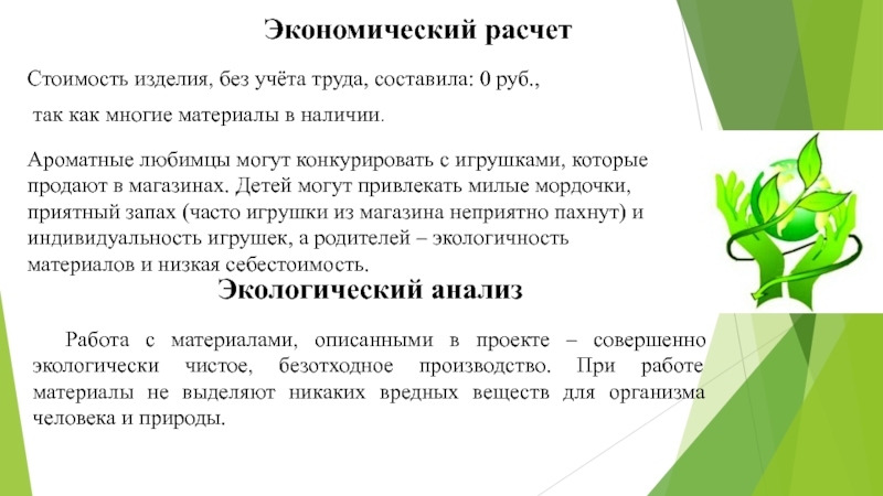 Работа с материалами, описанными в проекте – совершенно экологически чистое, безотходное производство. При работе материалы не выделяют никаких вредных веществ для организма человека и природы.