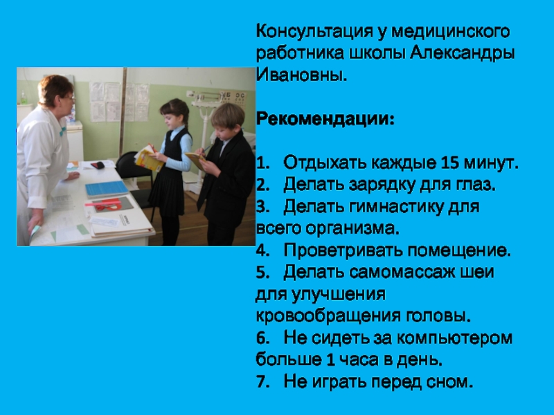 Слайд 7Консультация у специалистов: школьного медицинского работника, учителя информатики.