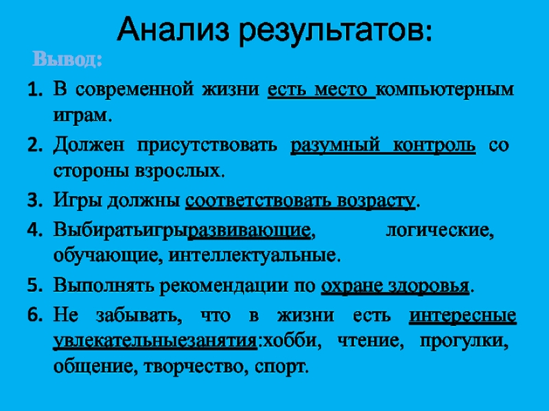 если играть в жестокие игры, то они приводят к насилию и агрессии; если подолгу засиживаться за компьютером, то ухудшится зрение, снижается желание общаться, могут появиться болезни суставов и позвоночника, компьютерные игры также вызывают привыкание, снижение успеваемости в школе.