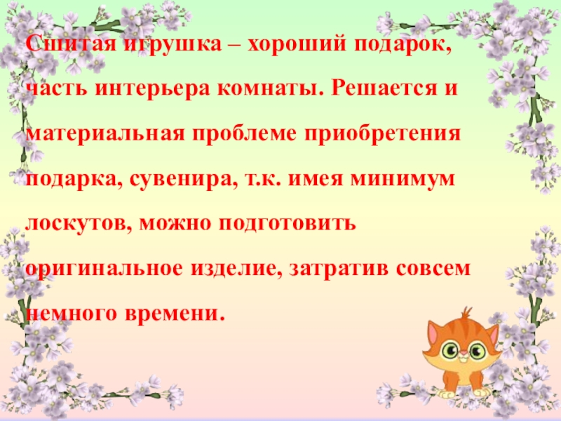 Сшитая игрушка – хороший подарок, часть интерьера комнаты. Решается и материальная проблеме приобретения подарка, сувенира, т.к. имея минимум лоскутов, можно подготовить оригинальное изделие, затратив совсем немного времени.