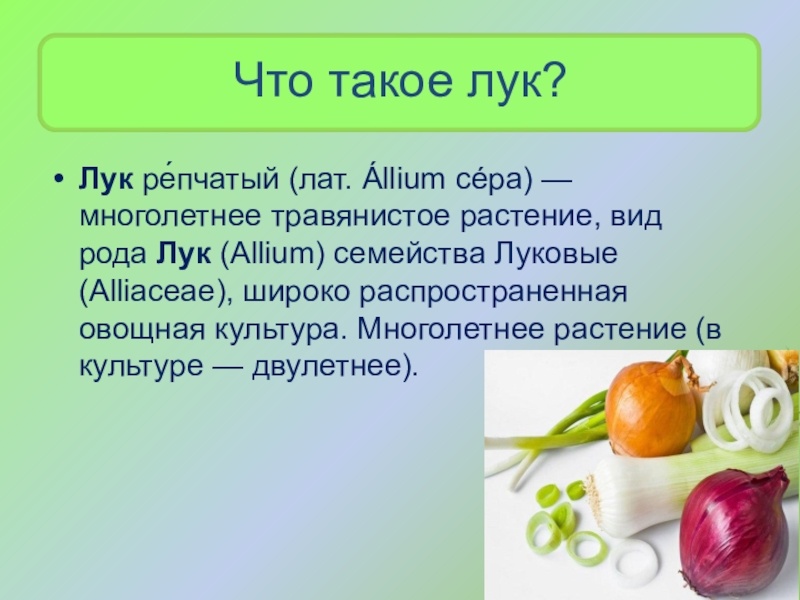 рода Лук (Allium) семейства Луковые (Alliaceae), широко распространенная овощная культура. Многолетнее растение (в культуре — двулетнее).