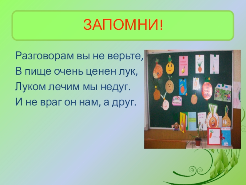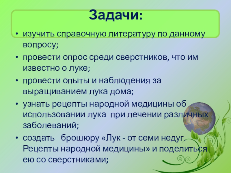 создать брошюру «Лук - от семи недуг. Рецепты народной медицины» и поделиться ею со сверстниками;