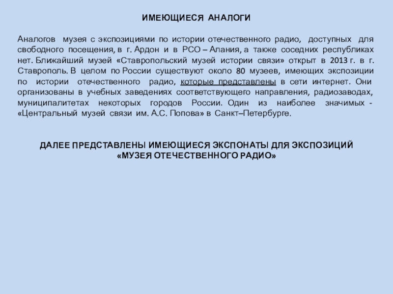 свободного посещения, в г. Ардон и в РСО – Алания, а также соседних республиках нет. Ближайший музей «Ставропольский музей истории связи» открыт в 2013 г. в г.Ставрополь. В целом по России существуют около 80 музеев, имеющих экспозиции по истории отечественного радио, которые представлены в сети интернет. Они организованы в учебных заведениях соответствующего направления, радиозаводах, муниципалитетах некоторых городов России. Один из наиболее значимых - «Центральный музей связи им. А.С. Попова» в Санкт–Петербурге.