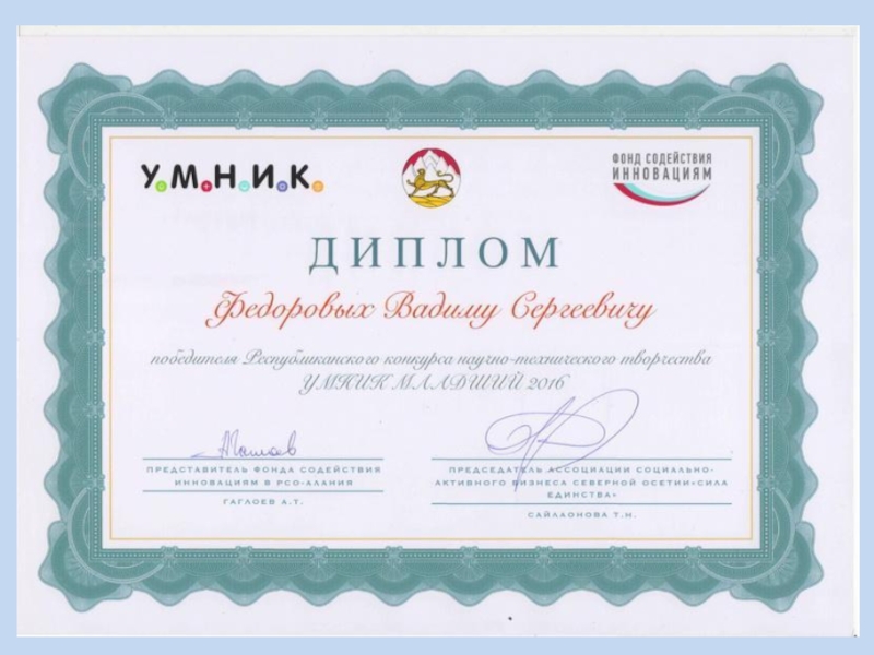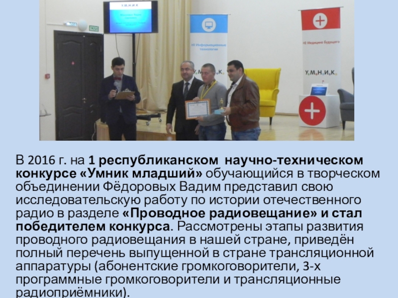 Слайд 10В 2016 г. на 1 республиканском научно-техническом конкурсе «Умник младший» обучающийся