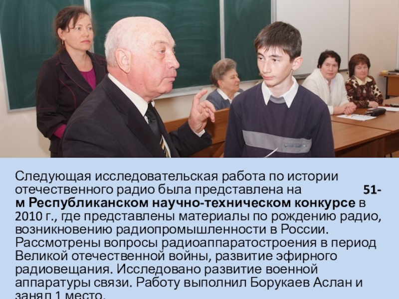 Слайд 5Следующая исследовательская работа по истории отечественного радио была представлена на