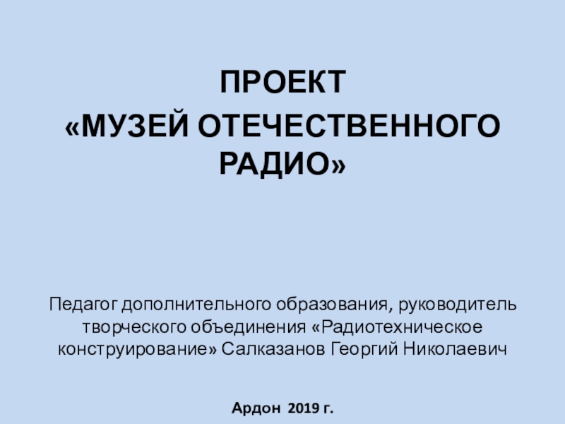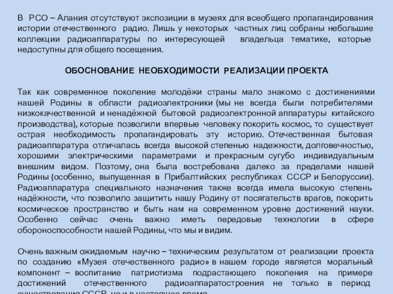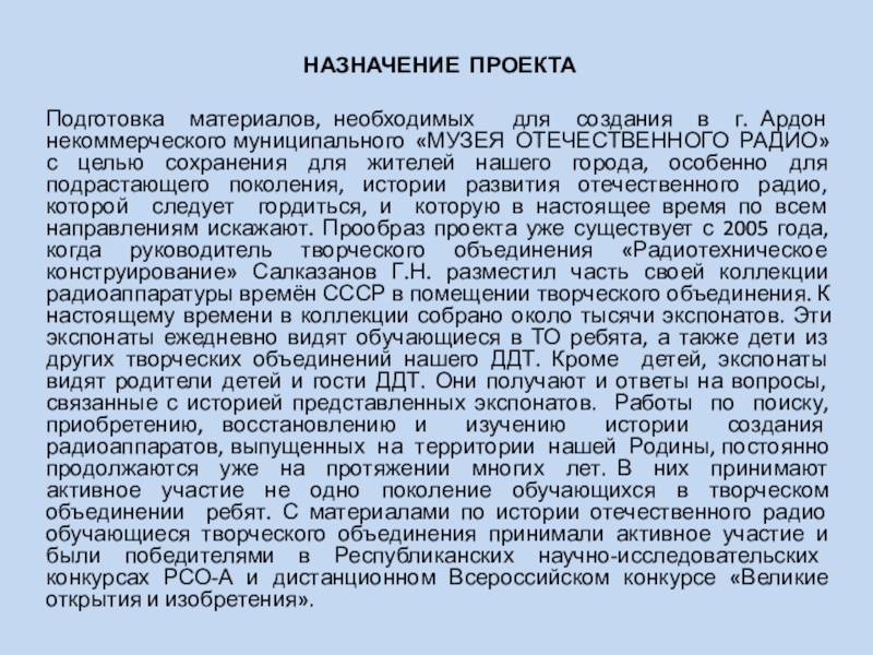 некоммерческого муниципального «МУЗЕЯ ОТЕЧЕСТВЕННОГО РАДИО» с целью сохранения для жителей нашего города, особенно для подрастающего поколения, истории развития отечественного радио, которой следует гордиться, и которую в настоящее время по всем направлениям искажают. Прообраз проекта уже существует с 2005 года, когда руководитель творческого объединения «Радиотехническое конструирование» Салказанов Г.Н. разместил часть своей коллекции радиоаппаратуры времён СССР в помещении творческого объединения. К настоящему времени в коллекции собрано около тысячи экспонатов. Эти экспонаты ежедневно видят обучающиеся в ТО ребята, а также дети из других творческих объединений нашего ДДТ. Кроме детей, экспонаты видят родители детей и гости ДДТ. Они получают и ответы на вопросы, связанные с историей представленных экспонатов. Работы по поиску, приобретению, восстановлению и изучению истории создания радиоаппаратов, выпущенных на территории нашей Родины, постоянно продолжаются уже на протяжении многих лет. В них принимают активное участие не одно поколение обучающихся в творческом объединении ребят. С материалами по истории отечественного радио обучающиеся творческого объединения принимали активное участие и были победителями в Республиканских научно-исследовательских конкурсах РСО-А и дистанционном Всероссийском конкурсе «Великие открытия и изобретения».