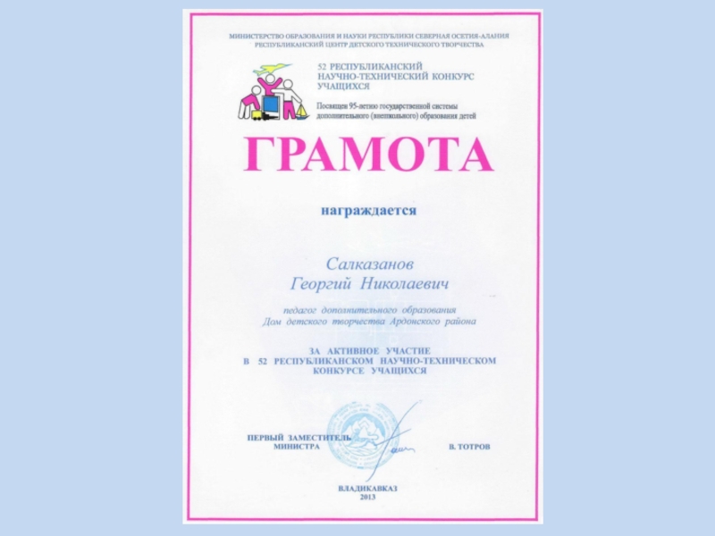 Слайд 7В 2013 г. на 52-м Республиканском научно-техническом конкурсе обучающиеся в творческом